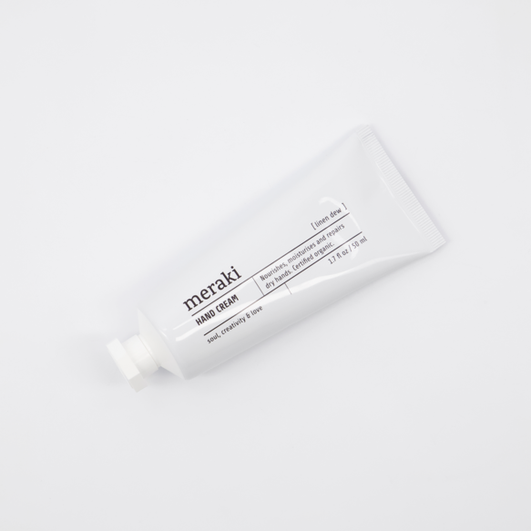 En håndcreme, som plejer, fugter og blødgør dine hænder uden at fedte. Linen Dew fra Meraki er rig på økologiske, plejende ingredienser som aloe vera, kakaosmør og avocadoolie, der ligeledes bidrager med antioxidanten E-vitamin. Certificeret COSMOS økologisk af Ecocert